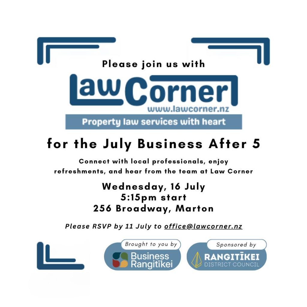 Events Upcoming Events July BA5 Wednesday 16th July5:15pm start256 Broadway Please join us for the July Business After 5 event, hosted by Law Corner.Connect with local professionals, enjoy refreshments, and hear from the team at Law Corner.Please RSVP by 11 July via this event or by emailing office@lawcorner.nz. Proudly brought to you by Business RangitīkeiProudly sponsored by Rangitīkei District Council Join Our Business Community Sign Up Now Supporting Business and Growth in th Rangitikei